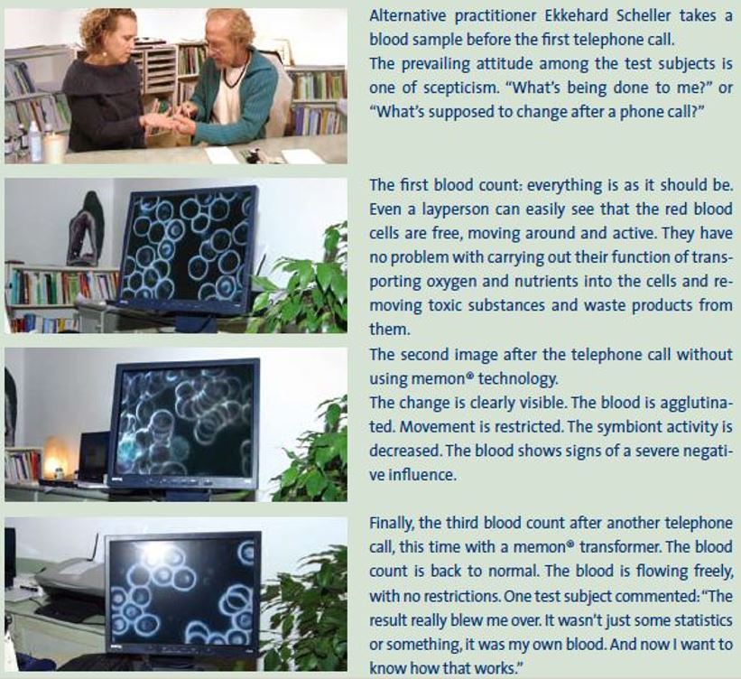 Here is a set of darkfield microscropy images showing the clumping of red blood cells after a cell phone call, and then their restoration through use of Memon: